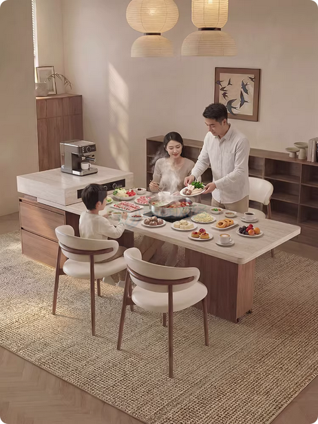 可伸缩岛台餐桌一体家用中古风高端西厨开放式岩板中岛台一体桌