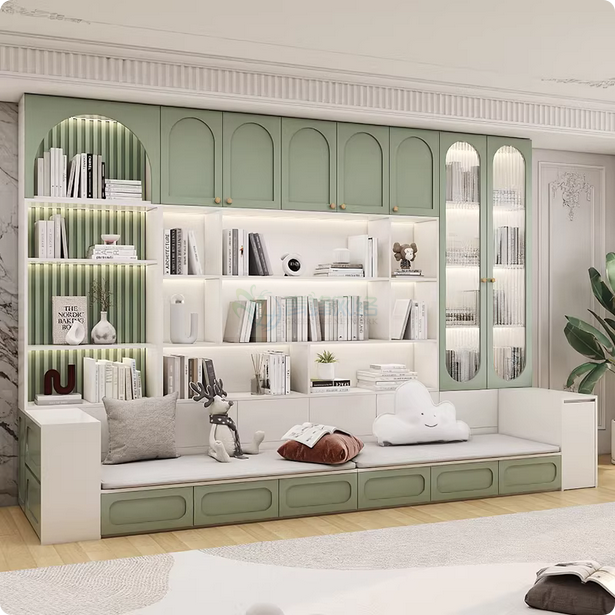 客厅沙发书柜储物柜一体满墙到顶定制美式实木书橱带卡座一体靠墙